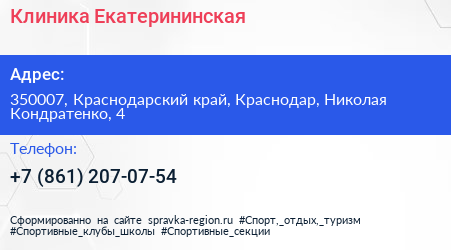 Клиника Екатерининская по адресу 350007, Краснодарский край, Краснодар, Николая Кондратенко, 4 в дальнейшем Организация, размещена в следующих категориях: