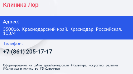 Клиника Лор по адресу 350016, Краснодарский край, Краснодар, Российская, 103/4 в дальнейшем Организация, размещена в следующих категориях: