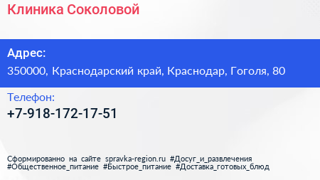 Клиника Соколовой по адресу 350000, Краснодарский край, Краснодар, Гоголя, 80 в дальнейшем Организация, размещена в следующих категориях: