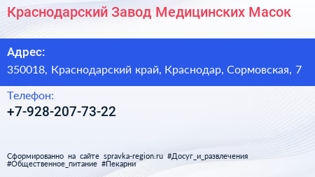 Краснодарский Завод Медицинских Масок по адресу 350018, Краснодарский край, Краснодар, Сормовская, 7 в дальнейшем Организация, размещена в следующих категориях: