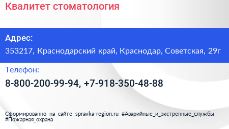 Квалитет, стоматология по адресу 353217, Краснодарский край, Краснодар, Советская, 29г в дальнейшем Организация, размещена в следующих категориях: