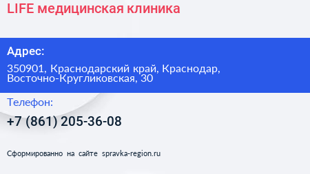 LIFE, медицинская клиника по адресу 350901, Краснодарский край, Краснодар, Восточно-Кругликовская, 30 в дальнейшем Организация, размещена в следующих категориях: