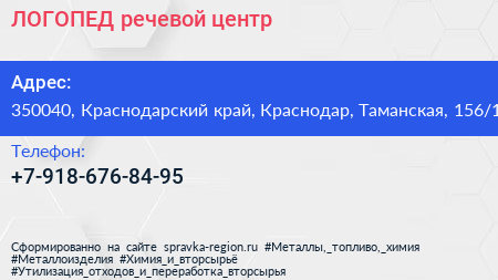 ЛОГОПЕД, речевой центр по адресу 350040, Краснодарский край, Краснодар, Таманская, 156/1 в дальнейшем Организация, размещена в следующих категориях: