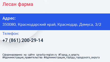 Лесан фарма по адресу 350080, Краснодарский край, Краснодар, Демуса, 3/2 в дальнейшем Организация, размещена в следующих категориях: