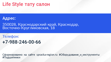 Life Style, тату-салон по адресу 350028, Краснодарский край, Краснодар, Восточно-Кругликовская, 18 в дальнейшем Организация, размещена в следующих категориях: