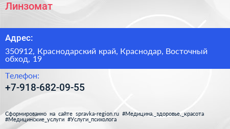 Линзомат по адресу 350912, Краснодарский край, Краснодар, Восточный обход, 19 в дальнейшем Организация, размещена в следующих категориях: