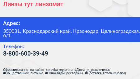 Линзы-тут, линзомат по адресу 350031, Краснодарский край, Краснодар, Целиноградская, 6/1 в дальнейшем Организация, размещена в следующих категориях: