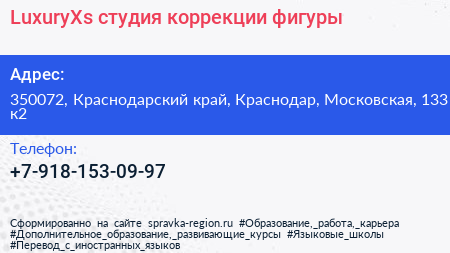 LuxuryXs, студия коррекции фигуры по адресу 350072, Краснодарский край, Краснодар, Московская, 133 к2 в дальнейшем Организация, размещена в следующих категориях: