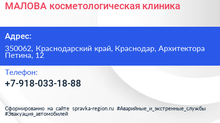 МАЛОВА, косметологическая клиника по адресу 350062, Краснодарский край, Краснодар, Архитектора Петина, 12 в дальнейшем Организация, размещена в следующих категориях: