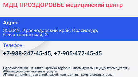 МДЦ ПРОЗДОРОВЬЕ, медицинский центр по адресу 350049, Краснодарский край, Краснодар, Севастопольская, 2 в дальнейшем Организация, размещена в следующих категориях: