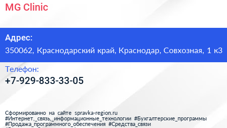 MG Clinic по адресу 350062, Краснодарский край, Краснодар, Совхозная, 1 к3 в дальнейшем Организация, размещена в следующих категориях: