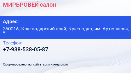 МИРБРОВЕЙ, салон по адресу 350016, Краснодарский край, Краснодар, им. Артюшкова, 5 в дальнейшем Организация, размещена в следующих категориях: