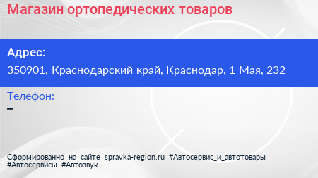 Магазин ортопедических товаров по адресу 350901, Краснодарский край, Краснодар, 1 Мая, 232 в дальнейшем Организация, размещена в следующих категориях: