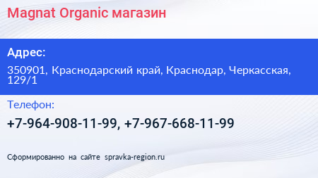 Magnat Organic, магазин по адресу 350901, Краснодарский край, Краснодар, Черкасская, 129/1 в дальнейшем Организация, размещена в следующих категориях: