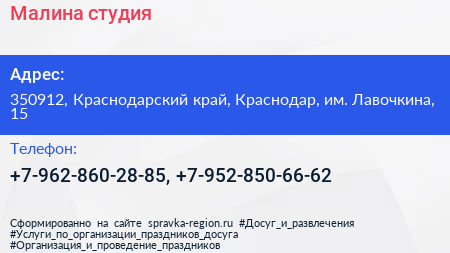 Малина, студия по адресу 350912, Краснодарский край, Краснодар, им. Лавочкина, 15 в дальнейшем Организация, размещена в следующих категориях: