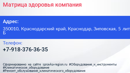 Для связи с организацией воспользуйтесь номером телефона: +7-918-376-36-35. Пн: c 09:00-18:00, Вт: c 09:00-18:00, Ср: c 09:00-18:00, Чт: c 09:00-18:00, Пт: c 09:00-18:00, Сб: выходной, Вс: выходной, вы можете обратиться в эту организацию.