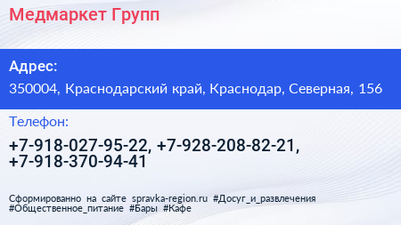 Медмаркет Групп по адресу 350004, Краснодарский край, Краснодар, Северная, 156 в дальнейшем Организация, размещена в следующих категориях: