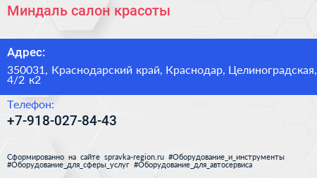 Миндаль, салон красоты по адресу 350031, Краснодарский край, Краснодар, Целиноградская, 4/2 к2 в дальнейшем Организация, размещена в следующих категориях: