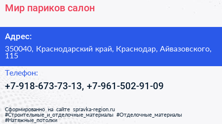 Мир париков, салон по адресу 350040, Краснодарский край, Краснодар, Айвазовского, 115 в дальнейшем Организация, размещена в следующих категориях: