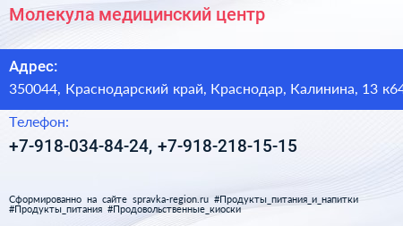 Молекула, медицинский центр по адресу 350044, Краснодарский край, Краснодар, Калинина, 13 к64 в дальнейшем Организация, размещена в следующих категориях: