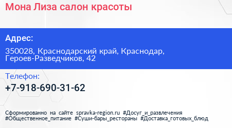 Мона Лиза, салон красоты по адресу 350028, Краснодарский край, Краснодар, Героев-Разведчиков, 42 в дальнейшем Организация, размещена в следующих категориях: