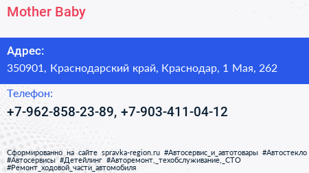 Mother & Baby по адресу 350901, Краснодарский край, Краснодар, 1 Мая, 262 в дальнейшем Организация, размещена в следующих категориях: