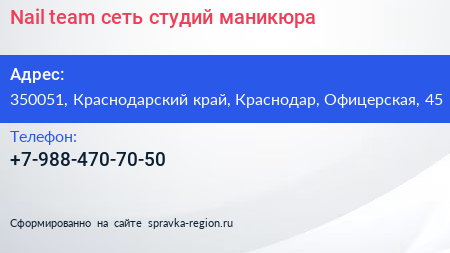 Nail team, сеть студий маникюра по адресу 350051, Краснодарский край, Краснодар, Офицерская, 45 в дальнейшем Организация, размещена в следующих категориях: