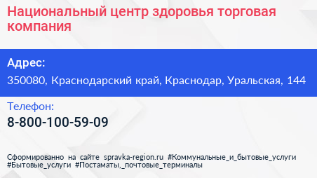 Национальный центр здоровья, торговая компания по адресу 350080, Краснодарский край, Краснодар, Уральская, 144 в дальнейшем Организация, размещена в следующих категориях: