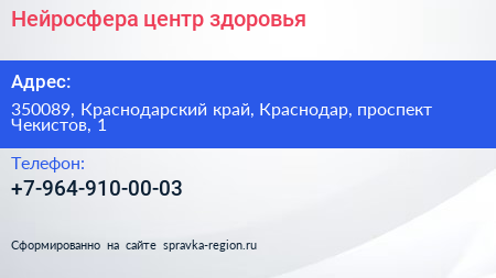 Нейросфера, центр здоровья по адресу 350089, Краснодарский край, Краснодар, проспект Чекистов, 1 в дальнейшем Организация, размещена в следующих категориях:
