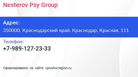 Nesterov Psy Group по адресу 350000, Краснодарский край, Краснодар, Красная, 111 в дальнейшем Организация, размещена в следующих категориях: