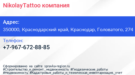 NikolayTattoo, компания по адресу 350000, Краснодарский край, Краснодар, Головатого, 274 в дальнейшем Организация, размещена в следующих категориях: