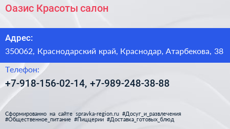 Оазис Красоты, салон по адресу 350062, Краснодарский край, Краснодар, Атарбекова, 38 в дальнейшем Организация, размещена в следующих категориях: