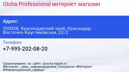 Olcha Professional, интернет-магазин по адресу 350028, Краснодарский край, Краснодар, Восточно-Кругликовская, 22/2 в дальнейшем Организация, размещена в следующих категориях: