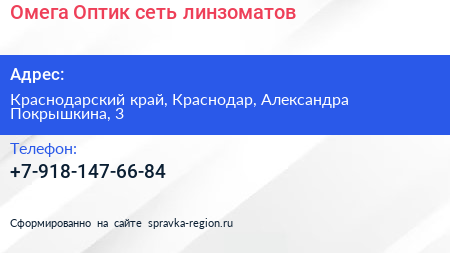 Омега Оптик, сеть линзоматов по адресу Краснодарский край, Краснодар, Александра Покрышкина, 3 в дальнейшем Организация, размещена в следующих категориях: