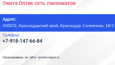 Омега Оптик, сеть линзоматов по адресу 350072, Краснодарский край, Краснодар, Солнечная, 18/3 в дальнейшем Организация, размещена в следующих категориях: