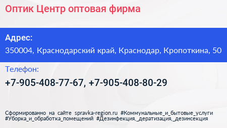 Оптик Центр, оптовая фирма по адресу 350004, Краснодарский край, Краснодар, Кропоткина, 50 в дальнейшем Организация, размещена в следующих категориях: