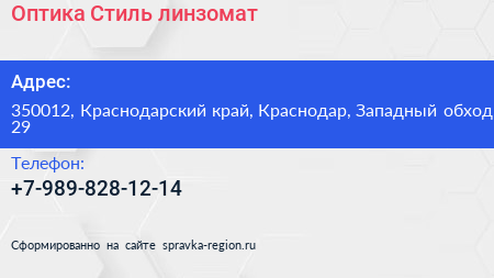Оптика Стиль, линзомат по адресу 350012, Краснодарский край, Краснодар, Западный обход, 29 в дальнейшем Организация, размещена в следующих категориях: