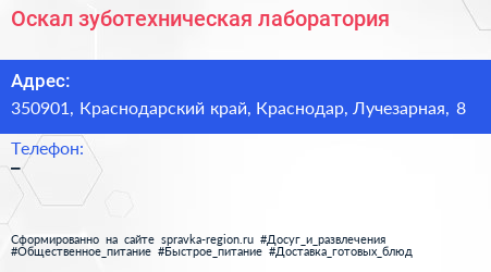 Оскал, зуботехническая лаборатория по адресу 350901, Краснодарский край, Краснодар, Лучезарная, 8 в дальнейшем Организация, размещена в следующих категориях: