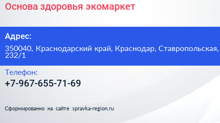 Основа здоровья, экомаркет по адресу 350040, Краснодарский край, Краснодар, Ставропольская, 232/1 в дальнейшем Организация, размещена в следующих категориях: