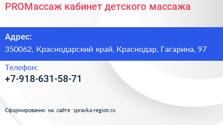 PROМассаж, кабинет детского массажа по адресу 350062, Краснодарский край, Краснодар, Гагарина, 97 в дальнейшем Организация, размещена в следующих категориях:
