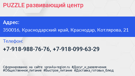 PUZZLE, развивающий центр по адресу 350016, Краснодарский край, Краснодар, Котлярова, 21 в дальнейшем Организация, размещена в следующих категориях: