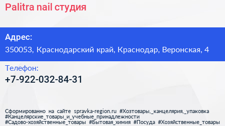 Palitra nail, студия по адресу 350053, Краснодарский край, Краснодар, Веронская, 4 в дальнейшем Организация, размещена в следующих категориях: