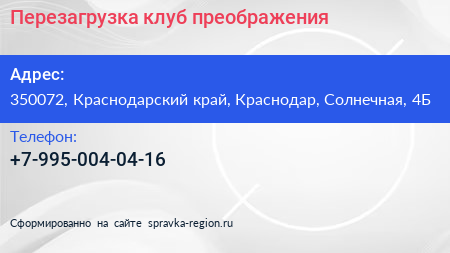 Перезагрузка, клуб преображения по адресу 350072, Краснодарский край, Краснодар, Солнечная, 4Б в дальнейшем Организация, размещена в следующих категориях: