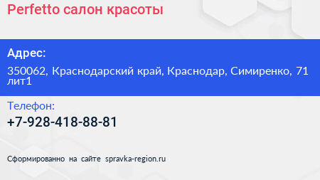 Perfetto, салон красоты по адресу 350062, Краснодарский край, Краснодар, Симиренко, 71 лит1 в дальнейшем Организация, размещена в следующих категориях: