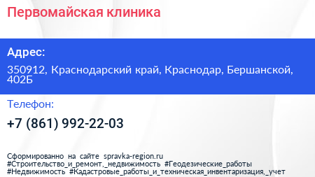 Первомайская, клиника по адресу 350912, Краснодарский край, Краснодар, Бершанской, 402Б в дальнейшем Организация, размещена в следующих категориях: