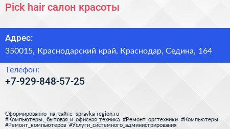 Pick hair, салон красоты по адресу 350015, Краснодарский край, Краснодар, Седина, 164 в дальнейшем Организация, размещена в следующих категориях:
