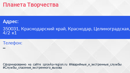 Планета Творчества по адресу 350031, Краснодарский край, Краснодар, Целиноградская, 4/2 к1 в дальнейшем Организация, размещена в следующих категориях: