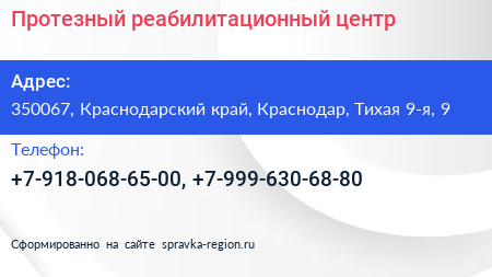 Протезный реабилитационный центр по адресу 350067, Краснодарский край, Краснодар, Тихая 9-я, 9 в дальнейшем Организация, размещена в следующих категориях: