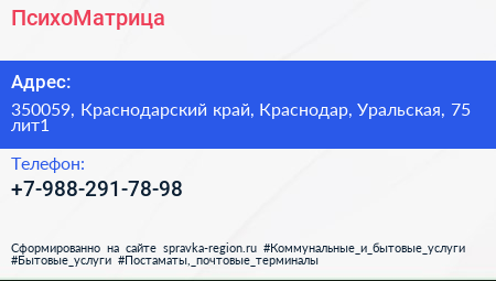 ПсихоМатрица по адресу 350059, Краснодарский край, Краснодар, Уральская, 75 лит1 в дальнейшем Организация, размещена в следующих категориях: