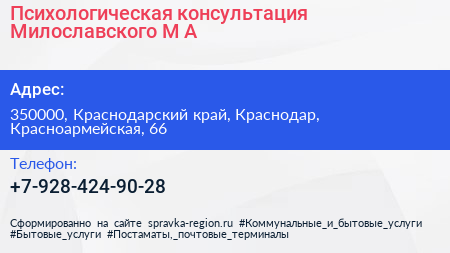 Психологическая консультация Милославского М.А. по адресу 350000, Краснодарский край, Краснодар, Красноармейская, 66 в дальнейшем Организация, размещена в следующих категориях: